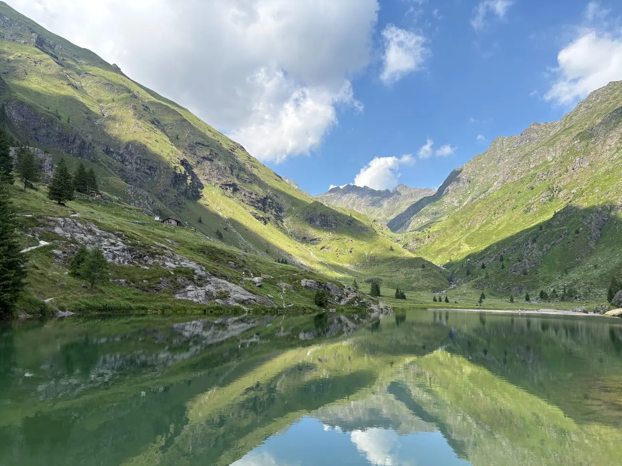 標高約1,267mの出発地点から牧草地や山小屋を通り、険しい山道を登りきるとダムの遺構が見え、その向こうに湖が望めます。
