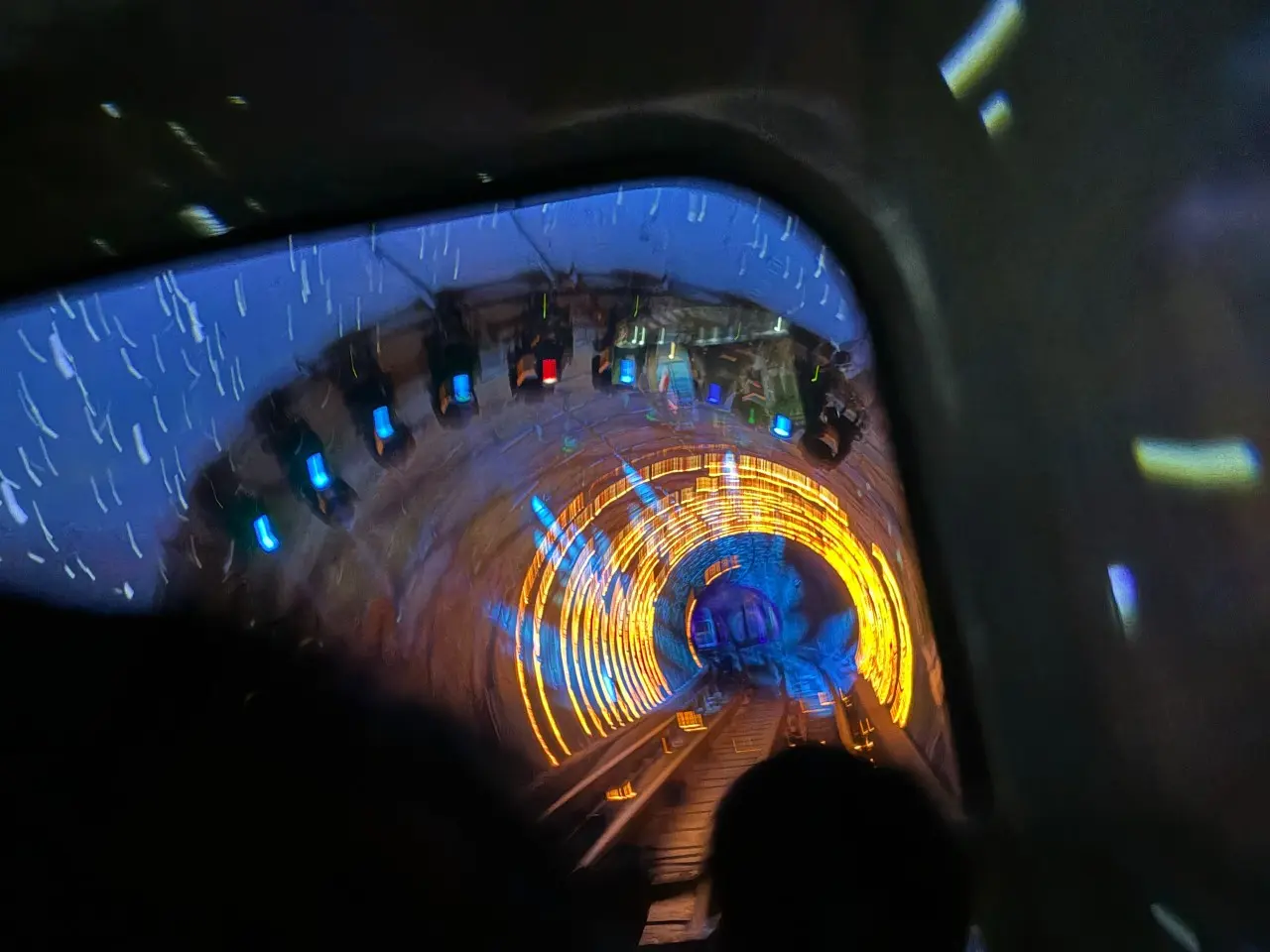そして、乗り物に乗ると、光と音の演出と共にかなりのスピードで暗闇の中を進み、あっという間に到着!