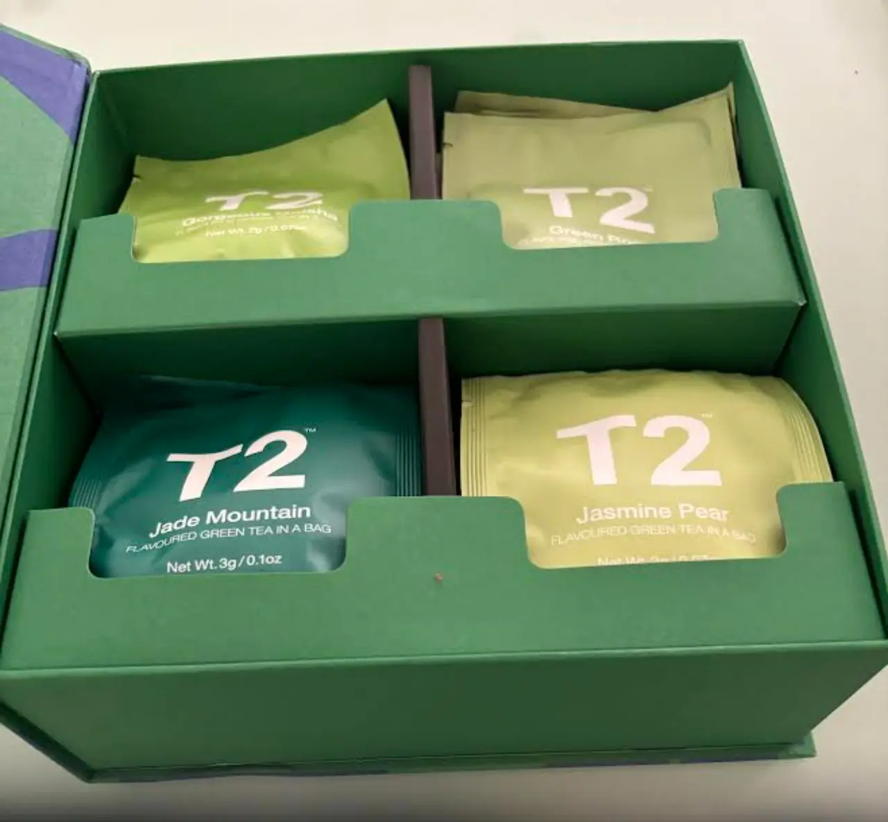 私たちがいただいたT2は大きめの箱に4種類のブレンドハーブティーが入っていて、箱も鮮やかな緑色でとてもきれいです。緑茶をベースとしたハーブティーのようですが、緑茶というよりはブレンドされたハーブの華やかな香りと味わいを楽しめます。