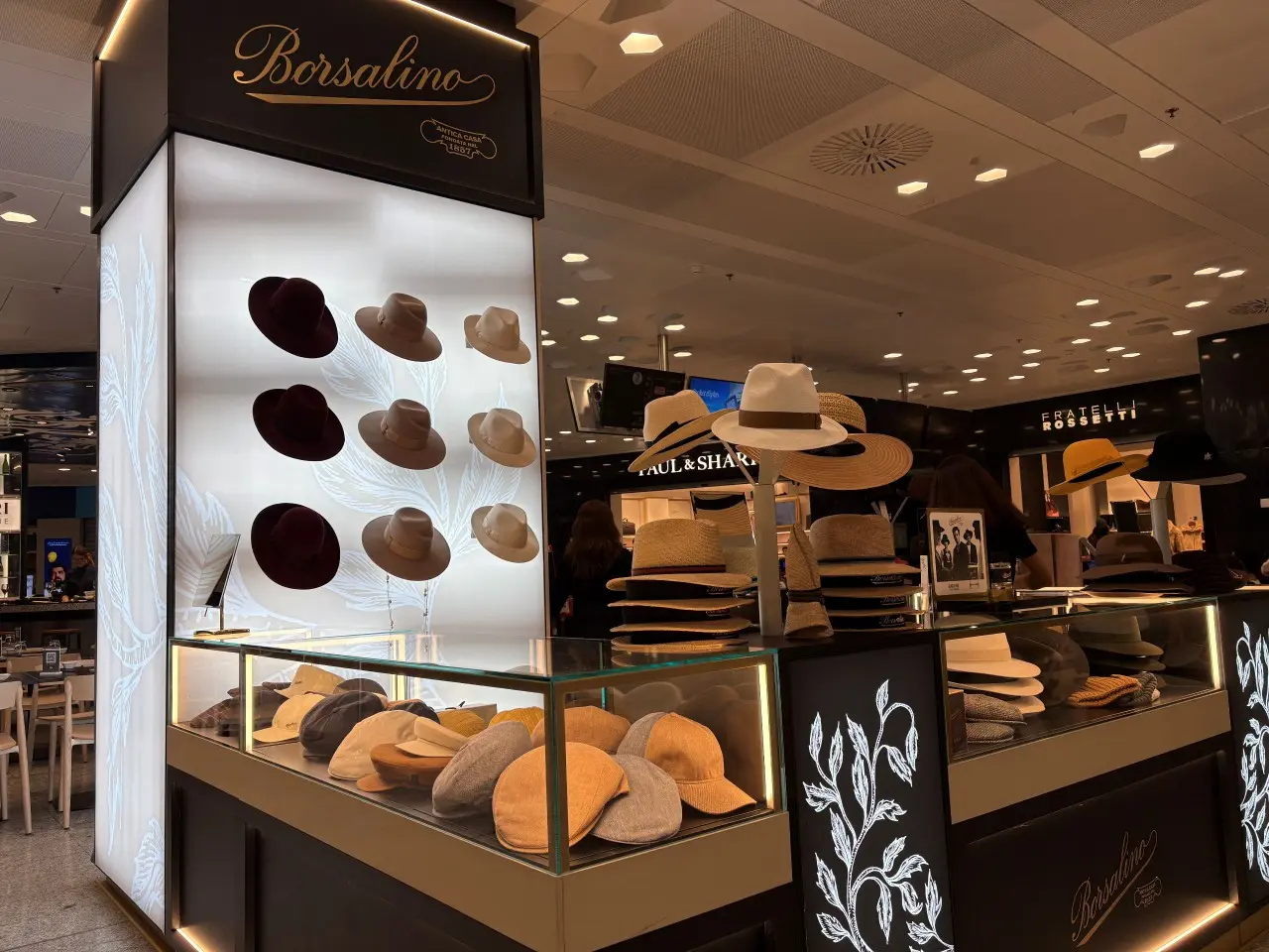 イタリアの主要国際空港であるミラノ/マルペンサ空港、ローマ/フィウミチーノ空港内にボルサリーノのショップがあります。